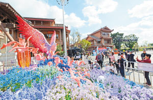 市民和游客在融创滇池后海巨型红嘴鸥装置前合影。