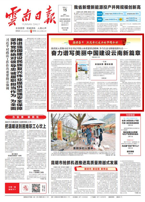 1月15日,云南日报头版重要位置刊发文章《我省深入贯彻习近平总书记考察云南重要讲话精神,争当生态文明建设排头兵——奋力谱写美丽中国建设云南新篇章》,聚焦云南推动生态环境保护治理迈上新台阶,筑牢西南生态安全屏障,奋力谱写美丽中国建设云南新篇章。