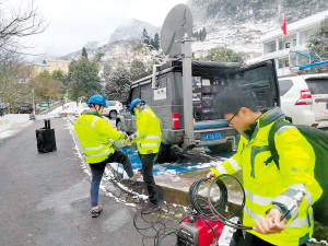 工作人员在山体滑坡灾害现场附近开展工作,保障救援现场通信畅通。 新华社