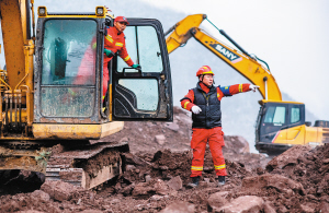 中国安能一局唐山分公司的职工崔吉鹏在救援现场指挥。新华社