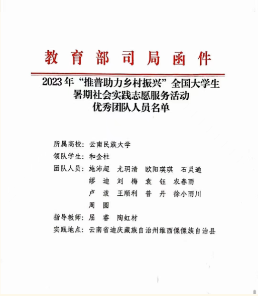 近日,云南民族大学收到教育部语言文字应用管理司和共青团中央青年发展部的表扬信,信中对云南民族大学马克思主义学院、管理学院(会计学院)组织的两支“推普助力乡村振兴”志愿服务团队表示肯定。