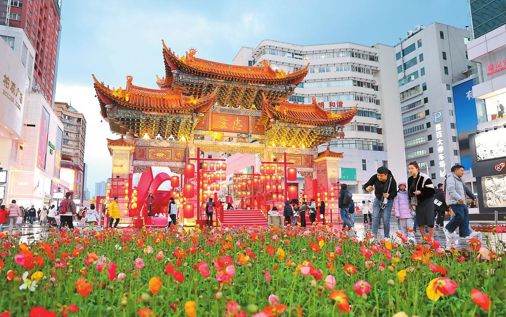 春节临近,年味渐浓。昆明市主城区的主要道路、广场、步行街等核心区域以及公园、车站等场所设置了立体花坛、花墙、花架等,鲜花扮靓城市,盛装喜迎佳节。(记者陈飞 摄)