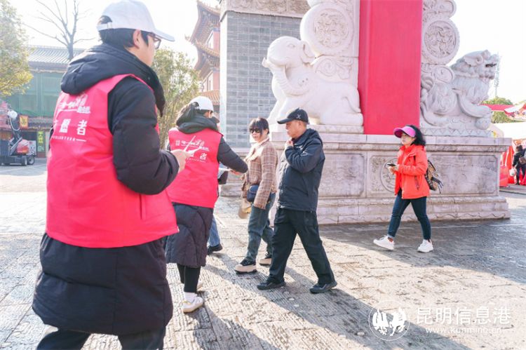 “游客朋友您好,我是今天的志愿者,很高兴为大家提供咨询服务,有啥不了解的地方尽管问我,希望大家在官渡古镇能够玩得开心愉快!”在官渡古镇景区,文旅志愿者们边维持着秩序、发送着云南文旅宣传卡,边一遍又一遍地不停重复着,用自己的服务向游客传达最贴心的问候。
