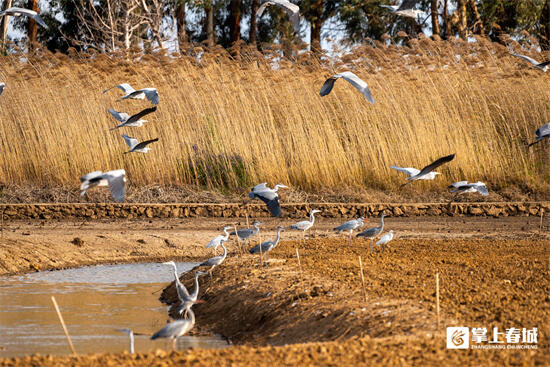 春节期间,云南省昆明市官渡区星海半岛湿地公园里,一群群绚丽多彩的水鸟自由翱翔,宛如彩虹穿梭于碧波之间。湖边的芦苇丛中,灰鹭、白鹭、苍鹭等优雅的水鸟们时而翩翩起舞,时而静静伫立,守候着湖面上的一举一动。