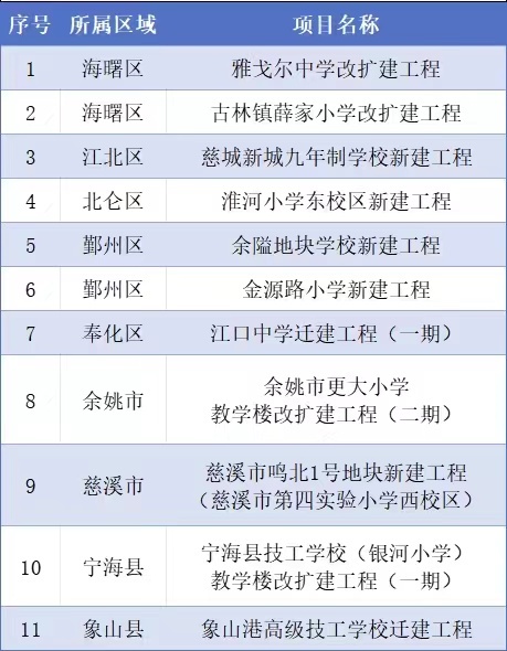 项目包括:雅戈尔中学改扩建工程、古林镇薛家小学改扩建工程、慈城新城九年制学校新建工程、淮河小学东校区新建工程、余隘地块学校新建工程、金源路小学新建工程、江口中学迁建工程(一期)、余姚市更大小学教学楼改扩建工程(二期)、慈溪市鸣北1号地块新建工程(慈溪市第四实验小学西校区)、宁海县技工学校(银河小学)教学楼改扩建工程(一期)、象山港高级技工学校迁建工程等中小学建设项目。