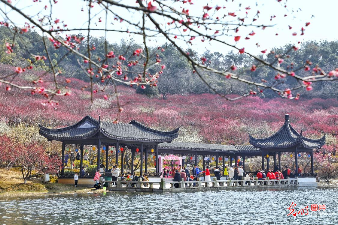 2024年3月3日,游客在安徽省巢湖市庙岗镇清水湾梅花园里赏花游玩。(马丰成摄/光明图片)