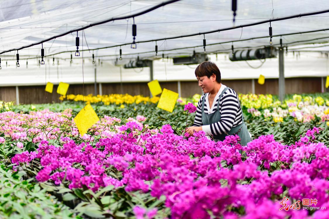2024年3月5日,在山东省青州市黄楼街道东建德村一处花卉种植基地,农民在管护蝴蝶兰。(王继林摄/光明图片)