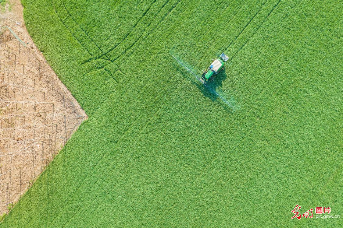 2024年3月3日,安徽省马鞍山市当涂县江心乡,农技人员正在驾驶自走式高杆喷雾机对小麦喷洒化学除草剂,提高小麦病虫害防治效果。(张明伟摄/光明图片)