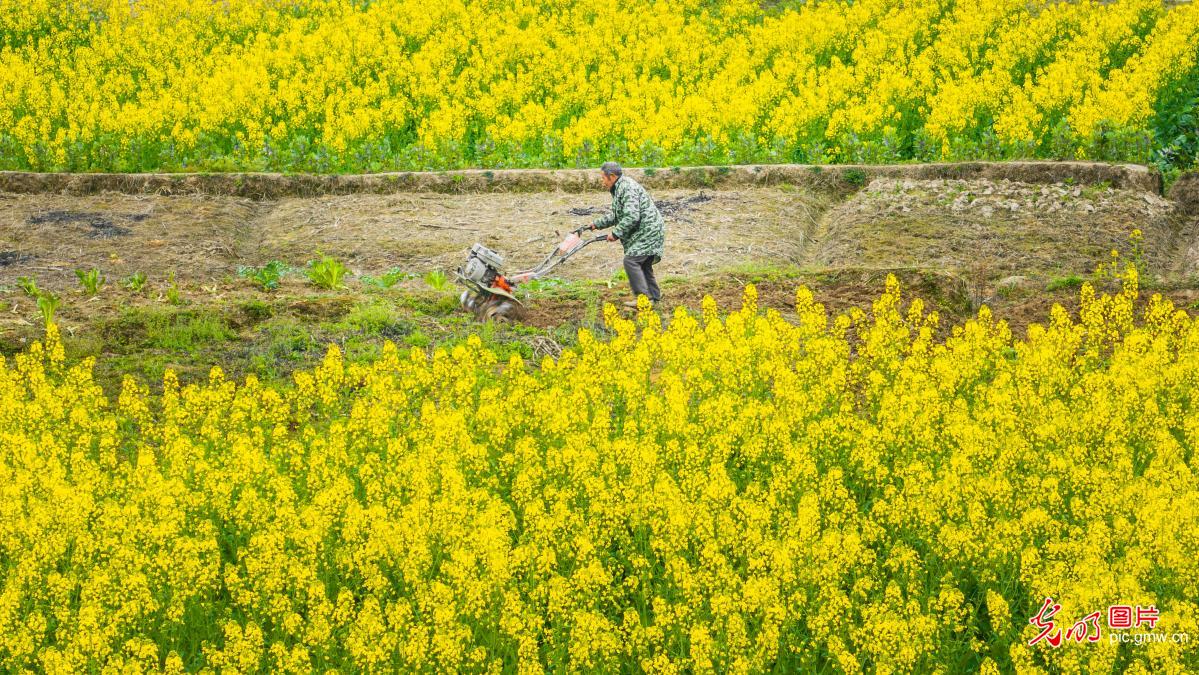 2024年3月2日,随着气温回升,重庆市开州区东华村的油菜花竞相绽放、花香四溢,村民们抢抓农时在花田里开展翻耕、春播、育苗等农事活动。(王晓宇摄/光明图片)