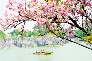 3月,石林湖畔、小石林出口、环林路等处樱花含苞、海棠妖娆,万年灵芝片区桃花盛开,各色野花、景观花卉遍布景区各处,春色醉人。
