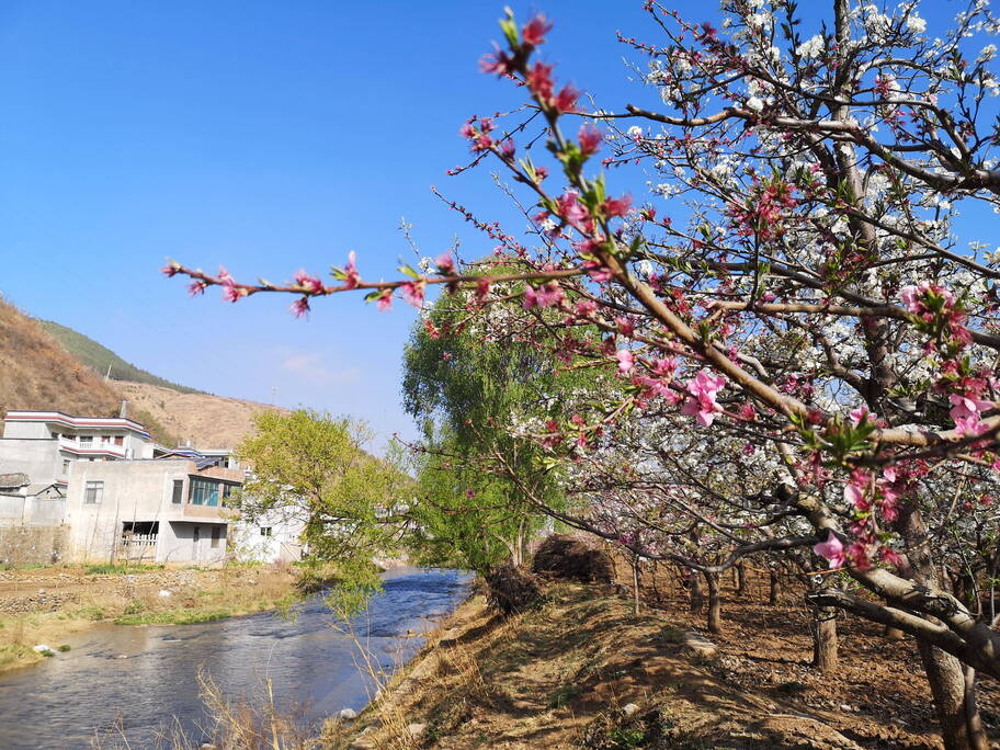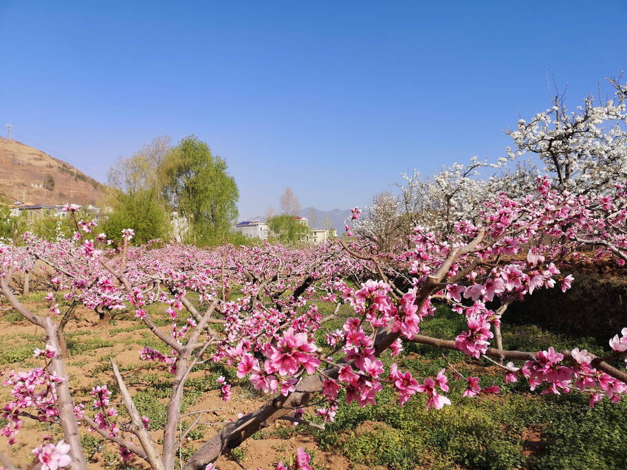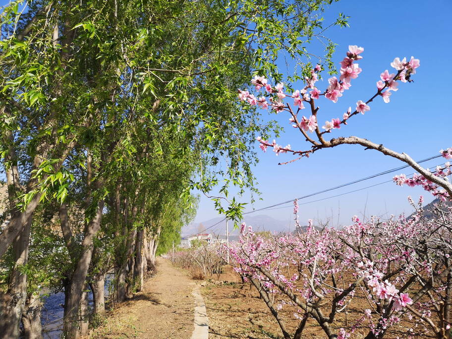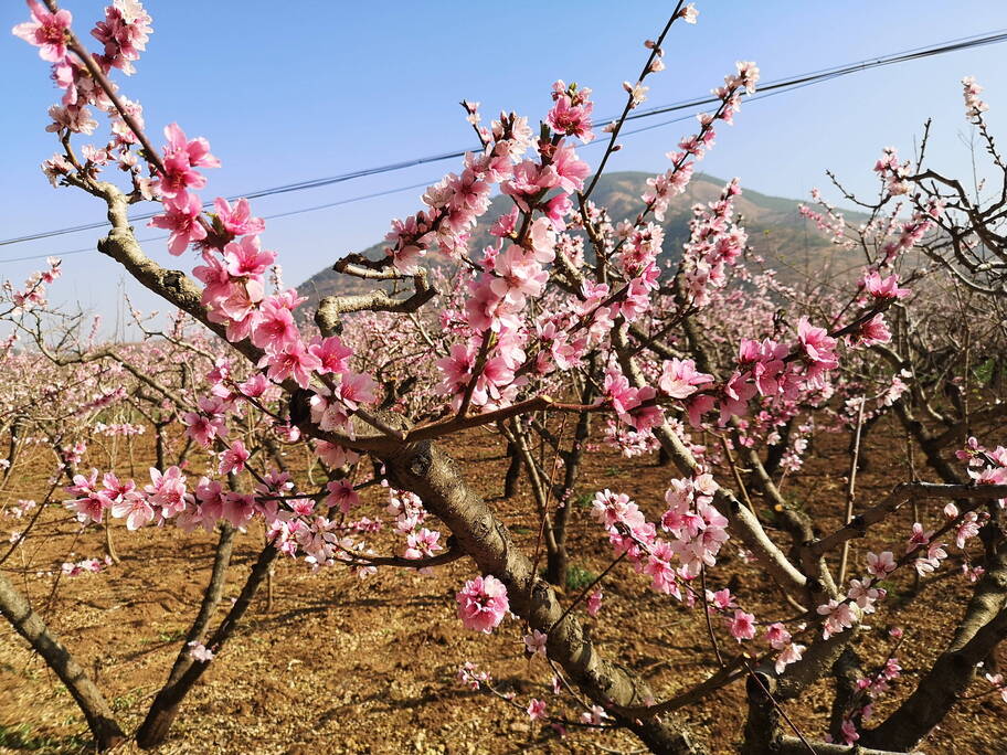 走进田间地头,花团锦簇,春色醉人。河畔两岸的果园里,初绽的花朵在枝头展露芳姿,朵朵争艳。连片成林的桃花园,远远看去就像是一片片粉红色的海洋,又象是天边飘落的云霞,光彩夺目,璀璨生辉,唯美之余增添了几丝壮观。走进桃林,一簇簇粉红色的桃花艳压枝头,妖而不俗,芳而不艳,开得分外妖娆,在和煦的阳光下吐出阵阵芬芳。