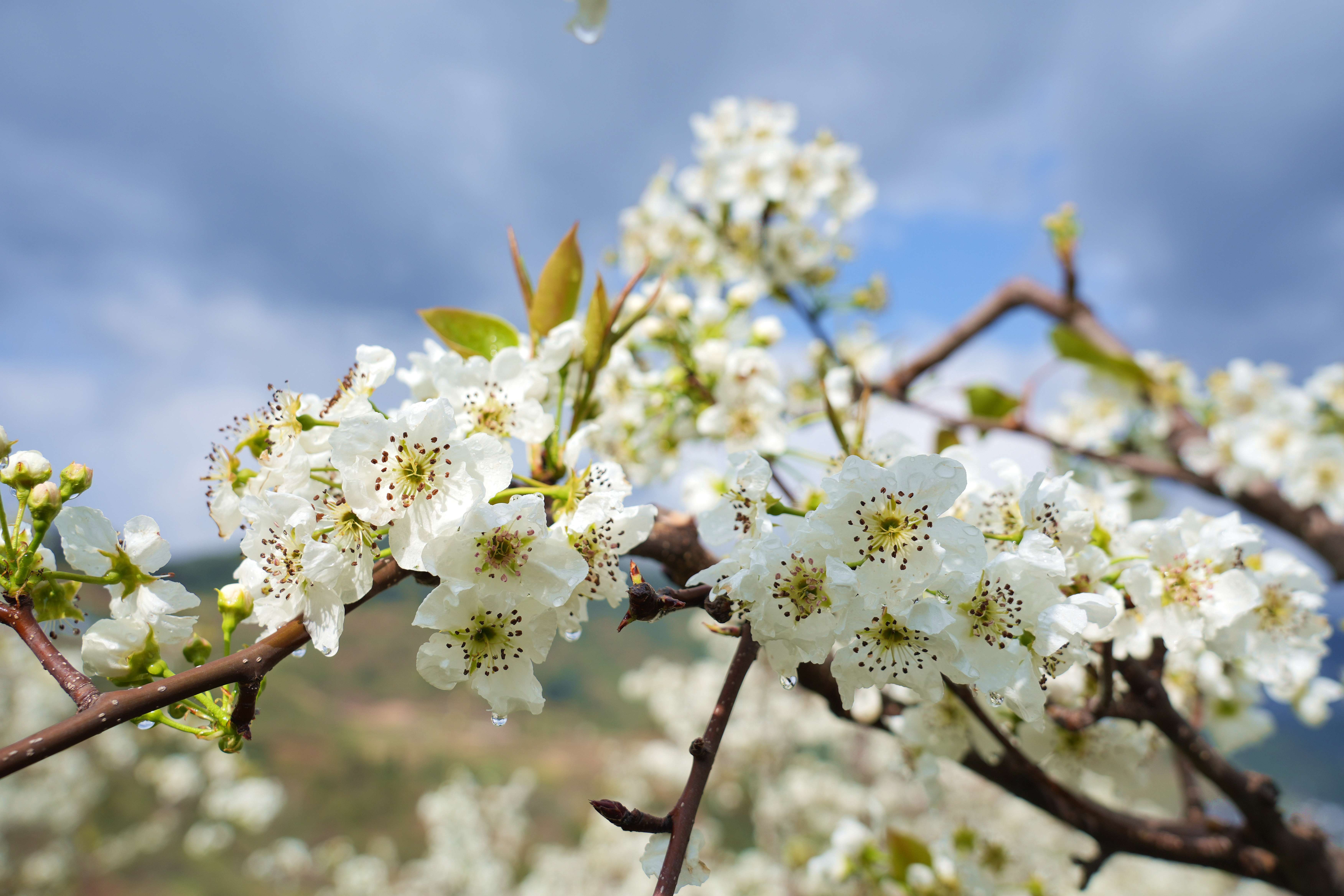 轻轻地触碰一朵带露的梨花,露珠随之滚落,微风拂过,携带着淡淡的花香,这片梨花林仿佛在轻轻地呼吸。