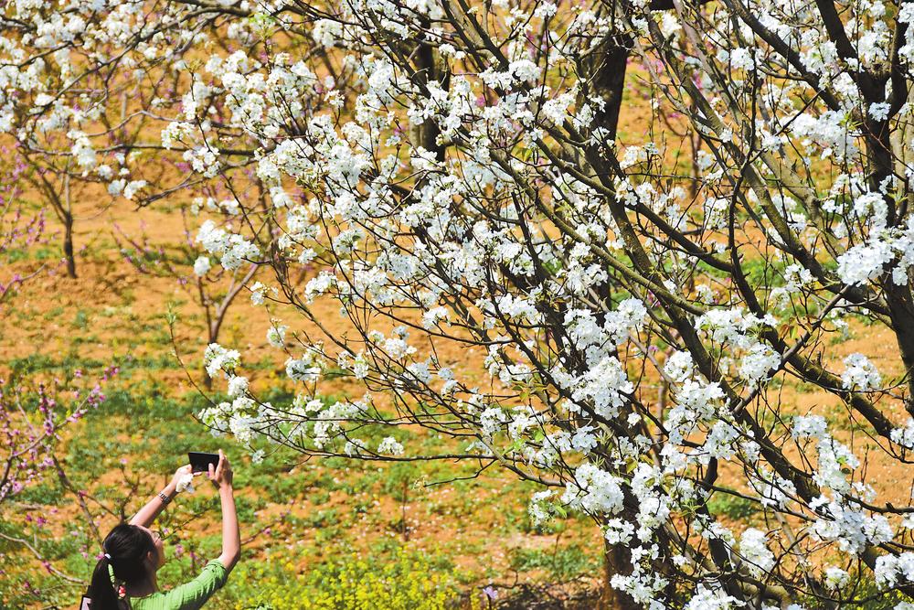 游客在加级寨梨花谷拍照。 本报通讯员 薛莹莹/摄