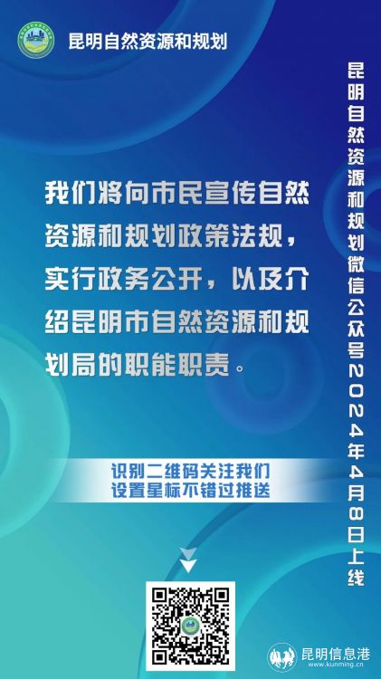 2024年4月8日,昆明市自然资源和规划局官方微信公众号“昆明自然资源和规划”正式上线运行。