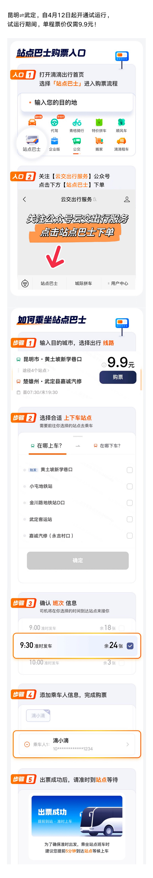 据悉,该线路由昆明交通运输集团有限公司承运,携手滴滴出行线上平台,开行初期限时优惠价9.9元。沿途停靠点有昆明端设立黄土坡立交桥新学巷口、小屯地铁口、金川路地铁口三个站点,武定端设立嘉诚汽车修理厂、武定汽车运输公司、武定顺安客运站三个站点,将最大限度为沿线乘客提供便乘服务。运营初期,投入8辆符合国家标准的营运车辆,首末班时间为7:30—19:30,约30-45分钟每班。并将根据乘客反馈适时调整运力及发班时间。