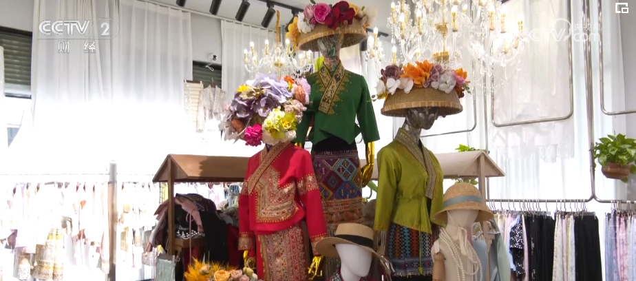 泼水节的到来,再加上旅拍市场的火热,民族服饰也出现了热销。在这家服装批发、零售店,负责人介绍,早在2024年2月份,店里就已经接到了泼水节相关的订单。最近每天,从早上9时到晚上10时,工作人员一直在加班加点地赶制服装。