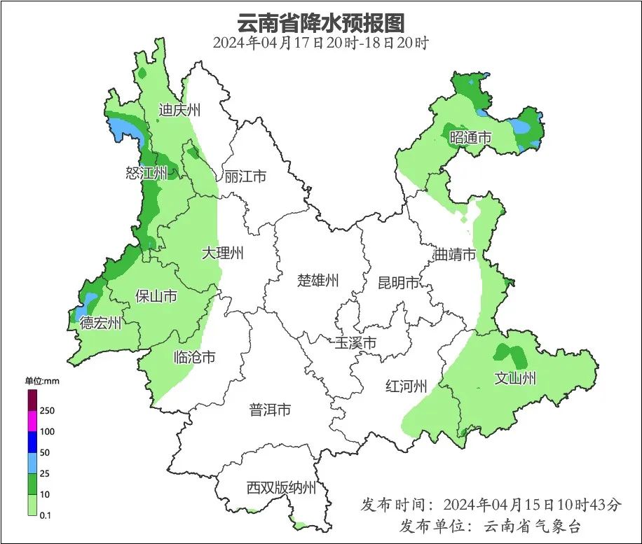 4月16日20时到4月17日20时:昭通市、曲靖市东部、文山州东部、迪庆州西部、怒江州、保山市北部、德宏州北部多云有阵雨局部中雨。