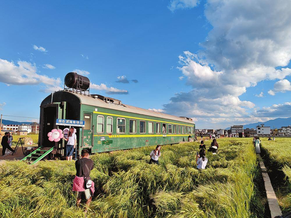 近段时间以来,位于大理市湾桥镇的一片麦田走红各大社交媒体平台,在蓝天白云下,风吹麦浪的场景吸引无数游客前来打卡拍照。