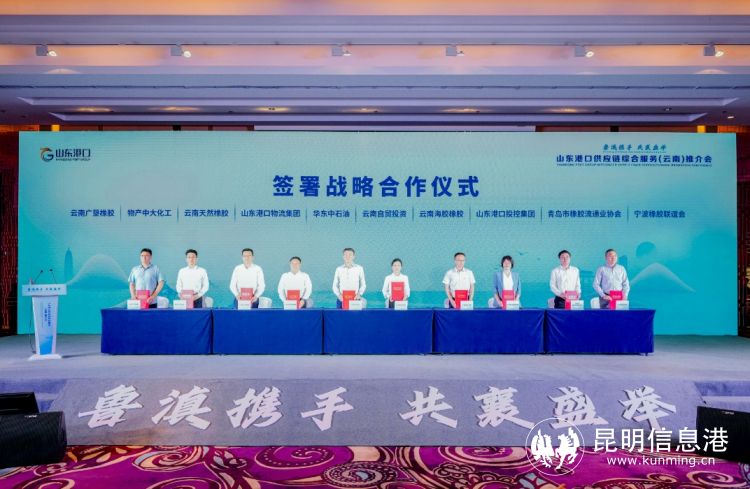 昆明信息港讯 记者李金梓 4月16日,山东港口在云南昆明成立内陆港,进一步助力扩大中老铁路黄金线路效应。17日,山东港口在云南省西双版纳傣族自治州举办供应链综合服务(云南)推介会,现场与华东中石油、云南天然橡胶、云南自贸投资、物产中大化工、云南海胶橡胶、云南广垦橡胶、青岛市橡胶流通业协会、宁波市橡胶联谊会签署战略合作协议,并同步启动西双版纳储运中心仓库开仓运营。