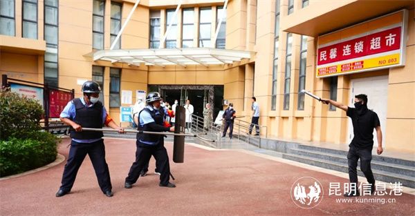 与此同时,医院监控中心值班室及时通过消防广播通知全院各科室启动防暴恐预案,各科室立即组织相关人员携带防暴恐装备器材把守各栋大楼入口,同时关闭各楼层通道,防止“歹徒”入侵,并安抚住院病人和群众。“歹徒”在院中奔跑冲撞、无法进入楼内,与医院保安展开对峙,县公安局特警大队与嵩阳派出所处突民警第一时间赶到县医院,组织警力对“歹徒”进行抓捕,在院内将其制服带走。随即组织民警、保安人员在院内巡查,确认是否有其他同伙藏匿,医院各科室清点人数,上报情况。