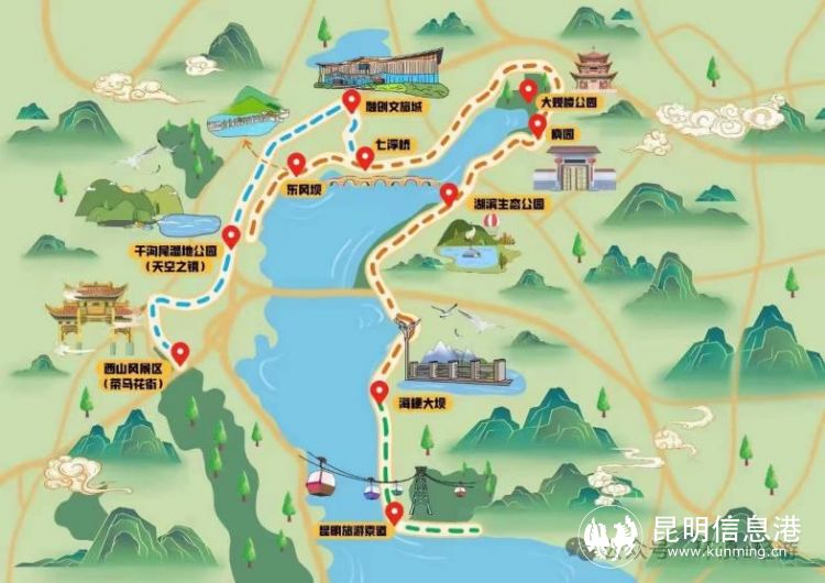线路途经主要景点有昆明旅游索道、海埂大坝、湖滨生态湿地公园、庾园、大观楼公园、融创文旅城、东风坝、七浮桥、干沟尾湿地公园(天空之镜)。