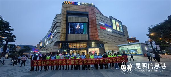 为积极践行新时代“枫桥经验”,昆明市公安局五华分局王家桥派出所牢固树立“警力有限、民力无穷”理念,创新打造“警企联动联户联勤”机制,全力构建“共建、共治、共享”的基层社会治理新格局。近日,王家桥派出所联合普吉街道、景文社区、昆明五华吾悦广场开展警企联动联户联勤启动仪式。