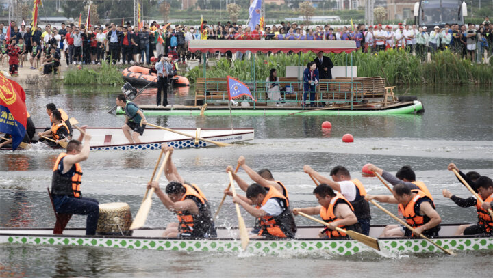 赛场上,龙舟竞渡,百舸争流,精彩不断;赛场下,龙舟文化,龙舟经济,风生水起。除精彩纷呈的龙舟赛外,包粽子大赛、互动抽奖、无人机表演等系列活动等也都异常火爆,此外,全省最强校园龙狮队伍集体亮相麒麟水乡,为龙舟参赛队助兴加油,现场还有舞龙、舞狮、舞麒麟基础动作教学互动、打卡合影等多项体验活动。数万名观众现场观看比赛,为自己喜欢的参赛队加油,一片热闹非凡的景象。当天晚上,1000架无人机表演“清凉曲靖·避暑天堂”各式各样的具有曲靖特色的图案在麒麟水乡的夜空中绽放。