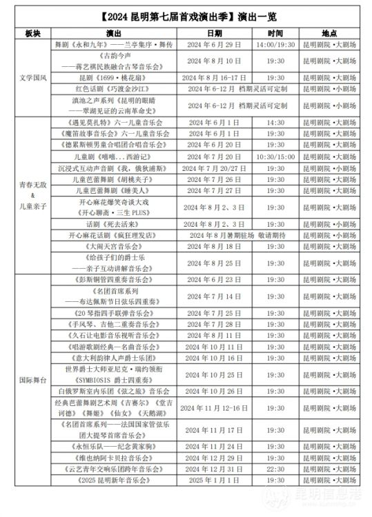 【2024昆明第七届首戏演出季】于2024年6月正式向观众呈现,汇聚当下国内外爆款演出以及原创先锋实验戏剧,数十部佳作已陆续开票、上演。本届【首戏演出季】下设“文学国风”“青春无敌&儿童亲子”和“国际舞台”三大板块,演出类型涵盖舞剧、话剧、戏曲、儿童剧、音乐会、沉浸式声音剧等多种形式。观众将依次欣赏到来自上海歌剧院、江苏省演艺集团昆剧院、德累斯顿男童合唱团、波兰爱乐乐团等国内外一线大团的得意之作,更将聆听久石让触及心底的柔软音符,以及来自世界名团首席们的非凡技艺。