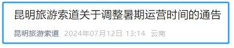 7月12日,昆明旅游索道发布关于调整暑期运营时间的通告,7月13日起暑期运营时间为8:30至18:00。详情如下: