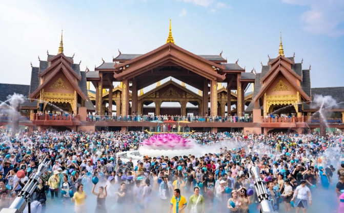 在全新升级打造的泼水广场,这里每天都举行泼水活动,可以体验泼水欢乐,还能够参与电音节蹦一场“傣迪”。