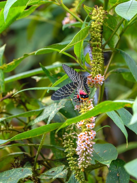 此次拍摄到的多尾凤蝶正穿梭在花朵间吸食花蜜。多尾凤蝶色彩漂亮,姿态优美潇洒,整个翅面是黑色的,中间有几条白色间黄的线条,尾部有两个红点像眼睛一样。