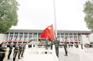 “全体肃立,升国旗、奏唱中华人民共和国国歌。”伴随着激昂雄壮的《义勇军进行曲》旋律,升旗手振臂一挥,鲜艳的五星红旗迎风招展,冉冉升起。