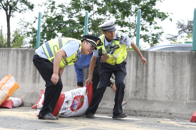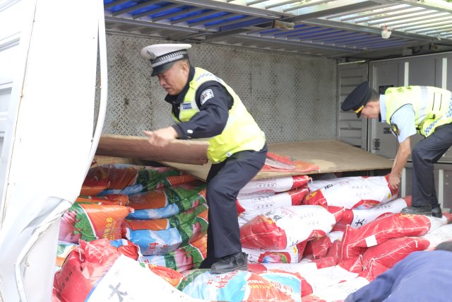 交警首先联合现场其他部门人员,将散落饲料搬移至路边,尽可能保证现场能有一个车道通行。施救车辆赶到现场后,民警组织现场救援人员对散落的5吨饲料进行搬运和清理,并对侧翻车辆进行起吊和拖离,现场很快恢复正常通行。