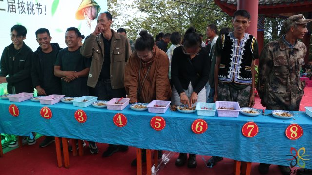 趣竞欢乐多。核桃节自然少不了趣味比赛,品核桃大赛,要求参赛者在规定时间内完成挑核桃、剥核桃、吃核桃动作,后由评委根据动作完成时间、核桃的品相对参赛选手进行综合评判打分。在主持人的鼓励打趣中,参赛者仔细挑选、小心剥开、大口咀嚼,台下的观众被这一趣味比赛吸引,纷纷报名参加。山歌大赛,以一男一女对唱形式开展,悠扬的歌声响彻广场,台下坐满了观众,听到兴起处都不自觉地鼓掌叫好,一位70岁的长者因为热爱唱山歌,现场主动报名参加,其热爱之情深深感动了台下的观众和评委。陀螺比赛,小陀螺转出大活力,参赛选手凭借惊人的臂力和准头,让陀螺的碰击声在陀螺场如雷般炸开,每一个选手都信心满满,观众的喝彩声不绝于耳。此次核桃节各项比赛活动均设置了奖项和奖品,吸引了许多游客主动参与。