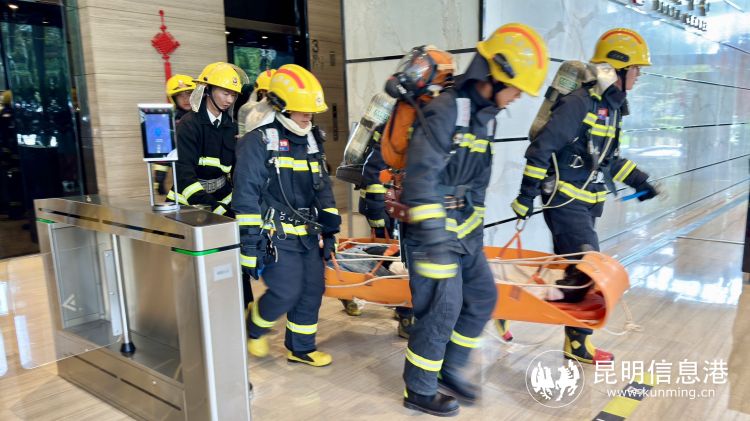 在火灾扑救实战演习中,模拟俊发中心3楼发生火灾,火势蔓延迅速,内部有多人被困,现场情况危急。接到报警后,盘龙区消防救援大队派出多支救援力量赶赴现场,全力排查、营救、疏散被困人员,并部署云梯车转移窗边呼救人员。