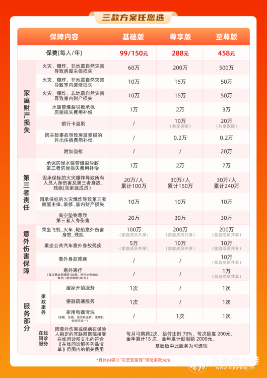 “该保险的持续推广,旨在健全云南普惠型保险体系,提升家财险覆盖面,增强居民抗风险能力,为云南社会稳定和经济发展贡献力量。未来我们将继续创新,为云南财产保险业发展、人民安居乐业贡献更多力量。”“彩云安居保”首席承保单位人保财险云南省分公司党委书记、总经理谢川峰表示,“彩云安居保”在去年试点基础上,升级优化了产品方案,涵盖家庭财产损失、第三者责任、人身意外等保障,新增家政服务流程优化及在线问诊服务,提供基础款(99/150元)、尊享款(288元)和至尊款(458元)三种方案,以低保费、高保额、全方位保障惠及更多家庭。