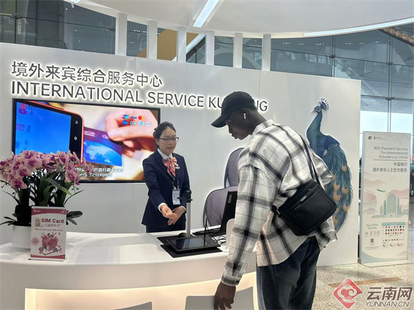 该中心选派精通外语、熟悉涉外业务的工作人员进驻,可为外籍抵滇人士提供专业、权威的综合服务指引,在原支付中心基础上增加了手机卡办理、交通售票、文旅咨询等相关服务。升级后服务中心按照支付、文旅、通信、交通四大模块功能,为入境国际旅客提供入境服务指南、《境外来宾服务手册》、旅游地图、手机SIM卡销售、交通卡销售、外币兑换、零钱包兑换、移动支付及人工咨询等综合性全天候贴心、便利服务。“我在这里办了手机卡,服务人员教我下载了微信,还给我介绍了云南很有特色的旅游景点,真的太方便了!”Baker表示,综合服务中心的服务人员给了自己很多帮助,提供的服务很全面。