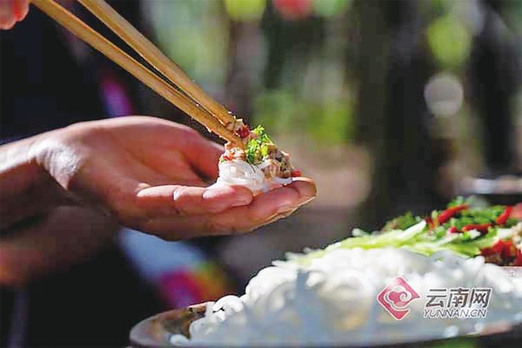 清香爽口的过手米线是陇川阿昌族人掌心里的美味。过手米线的制作过程颇为复杂和讲究。炙烤后的猪肉剁碎,加上烤猪皮、猪肝、大蒜、花生碎、稀豆粉、芫荽等配料,再浇上一勺用酸杨梅或米汤发酵的“灵魂酸水”,才算大功告成。食用时,以手为碗,更有风味。