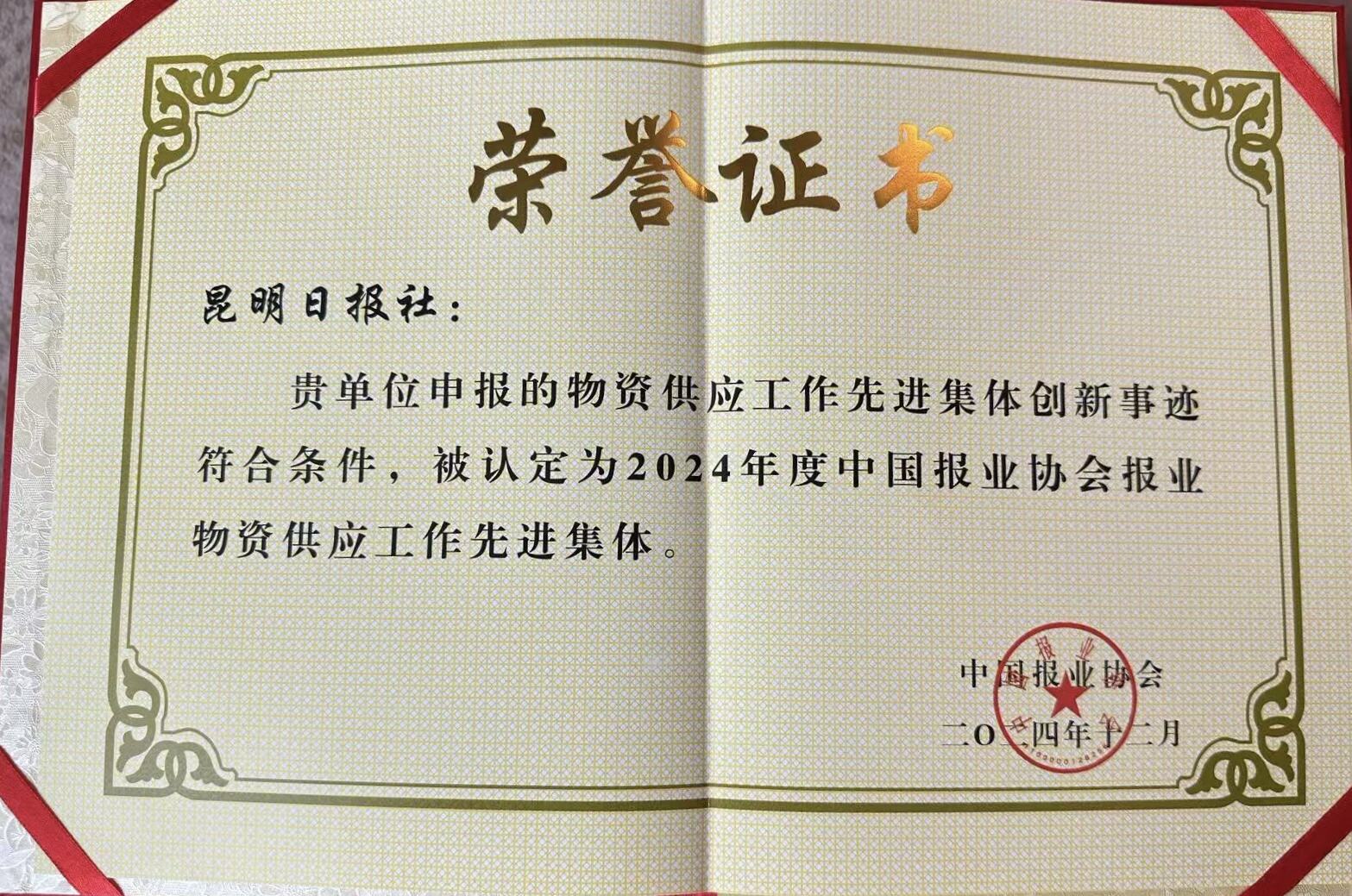 12月4日,中国报业物资供应年会在浙江省湖州市召开。会上,公布了入选“2024年报业物资供应工作先进集体”单位名单。昆明日报社印刷厂在物资供应服务、采购、管理等方面展现了高效、专业的能力,为报业的顺畅运行和持续发展提供了有力保障,荣获中国报协“2024年度报业物资供应先进集体”称号。
