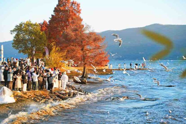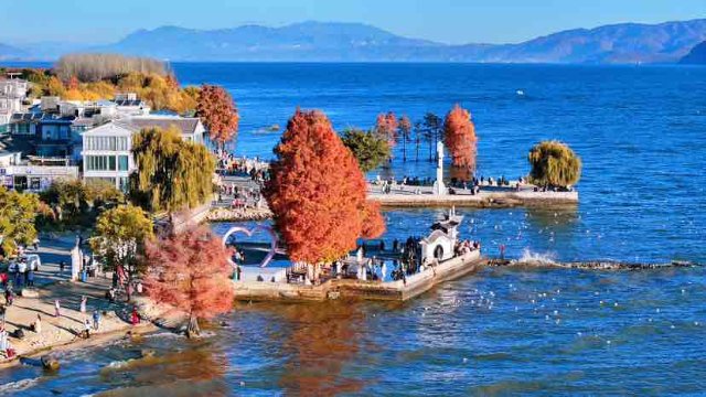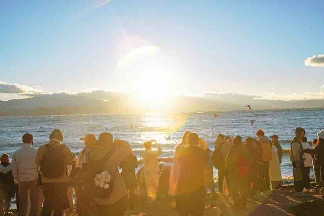 冬日清晨,当第一缕阳光轻轻拂过洱海水面,龙龛码头迎来了它最美的时刻。鸥声阵阵,看日出的人群已经等候在岸边。当第一缕阳光从山那边云缝里探出头,岸上的静谧被瞬间打破。