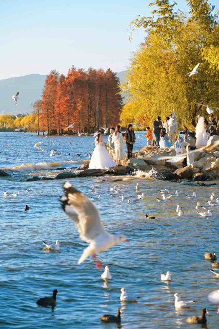 一对对恋人在这里留下了他们最美好的瞬间,背景是那绚烂的日出和宁静的洱海,这样的画面,无疑是爱情最美的见证。