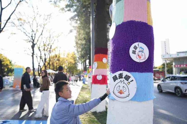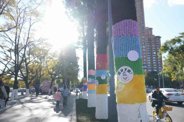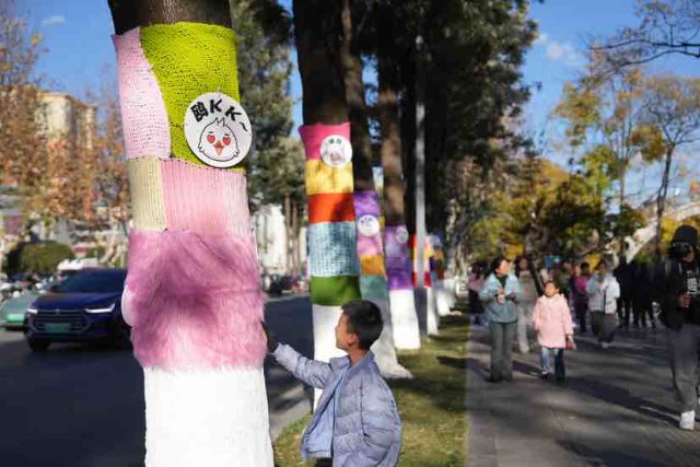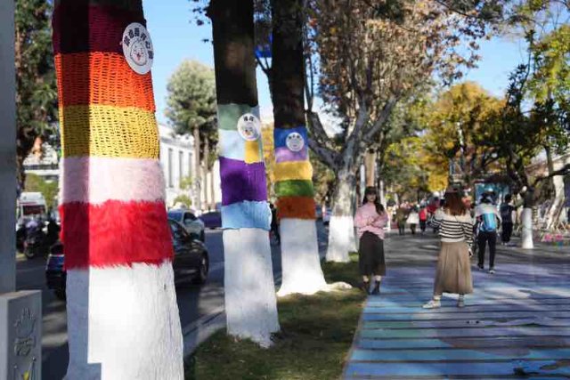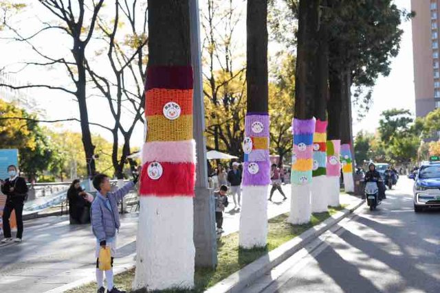 近日昆明市大观路旁的大树“换”上了多巴胺配色的“毛衣”