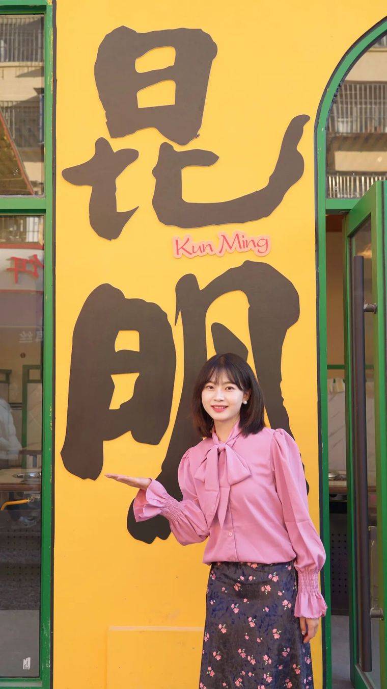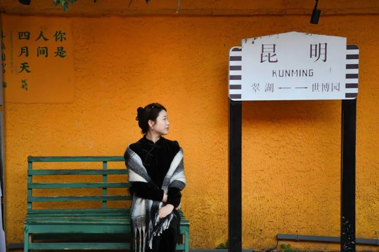 位于华山南路的街道上,一栋楼的黄色墙体上有着挥洒自如的“昆明”二字,配合街边中式的特色建筑,凸显了城市的文化特色和艺术气息。位于打卡点附近的南来盛咖啡馆是一家历史悠久且富有传奇色彩的咖啡馆,最初由越南女老板阮民宣在20世纪30年代开设,以其独特的文化氛围、优质的咖啡和特色的面包而闻名,曾接待过许多著名人物,如胡志明、陈嘉庚、沈从文等,是很多人心中的一个昆明文化地标。在这家咖啡馆的楼上也有一处与“昆明”合影的绝佳的打卡机位,是很多年轻游客的热门选择。