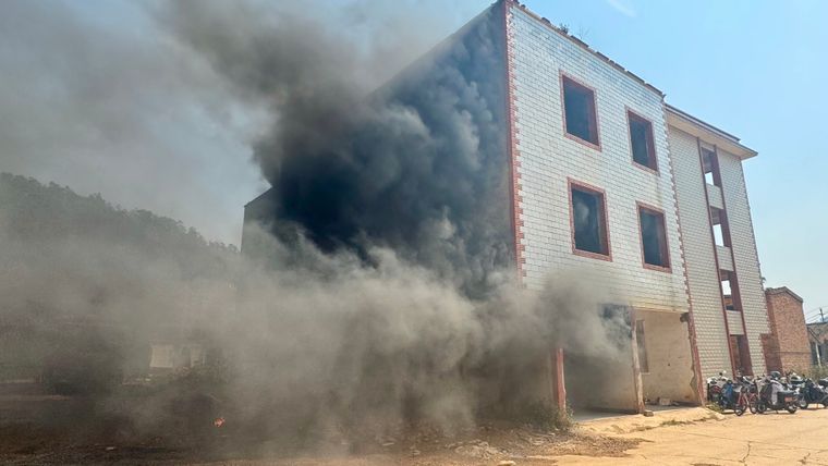 现场,楼道内停放的两辆电动自行车,模拟电瓶短路导致起火。大约10秒后,电动自行车电瓶处冒出白烟,约5分钟后,电动自行车整个车身开始着火。火势渐大,电动自行车发出噼里啪啦的爆炸声,现场烟味刺鼻,白烟变成黑烟。电动自行车燃烧的烟雾通过楼梯向上蔓延,从二楼窗口处冒出滚滚黑烟。