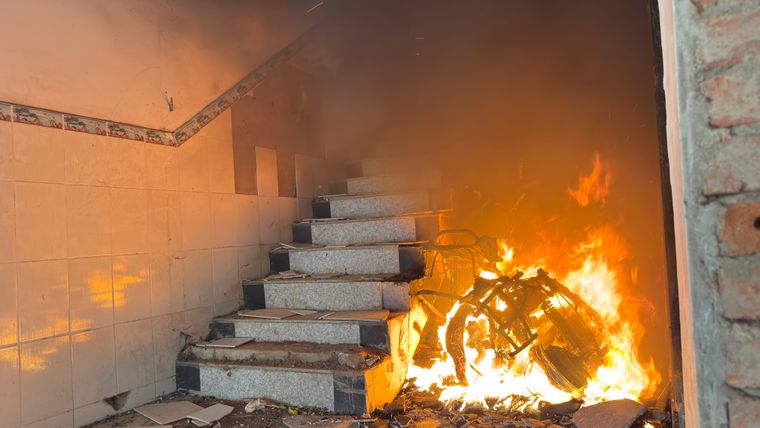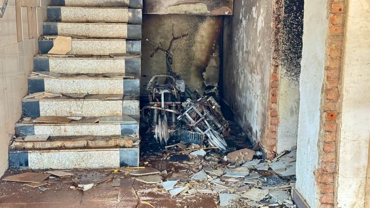 随后,穿戴整齐的消防员使用水枪,足足用了5分钟,才将电动自行车的火势熄灭。为防止复燃,消防员还持续不断地对电瓶进行降温处理。火势彻底熄灭后,记者进入楼内看到,电动自行车已经被烧得只剩下一个架子。
