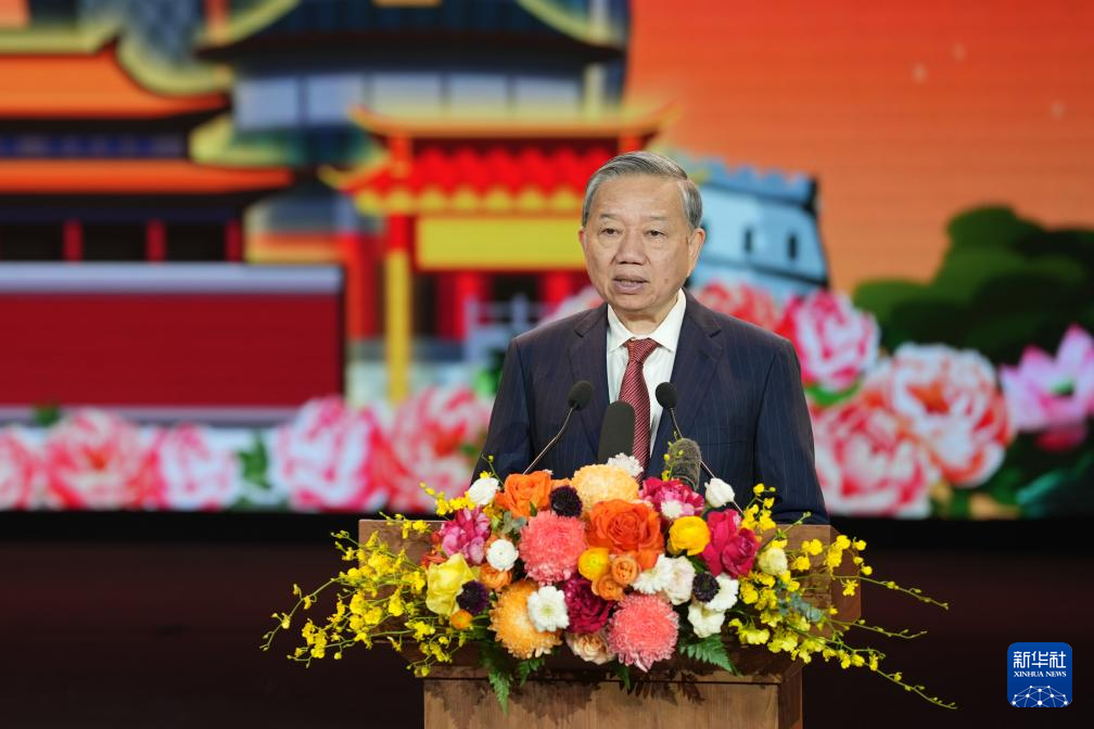 3月20日,在越南首都河内的越中友谊宫,越共中央总书记苏林在见面会上致辞。新华社记者 胡佳丽 摄