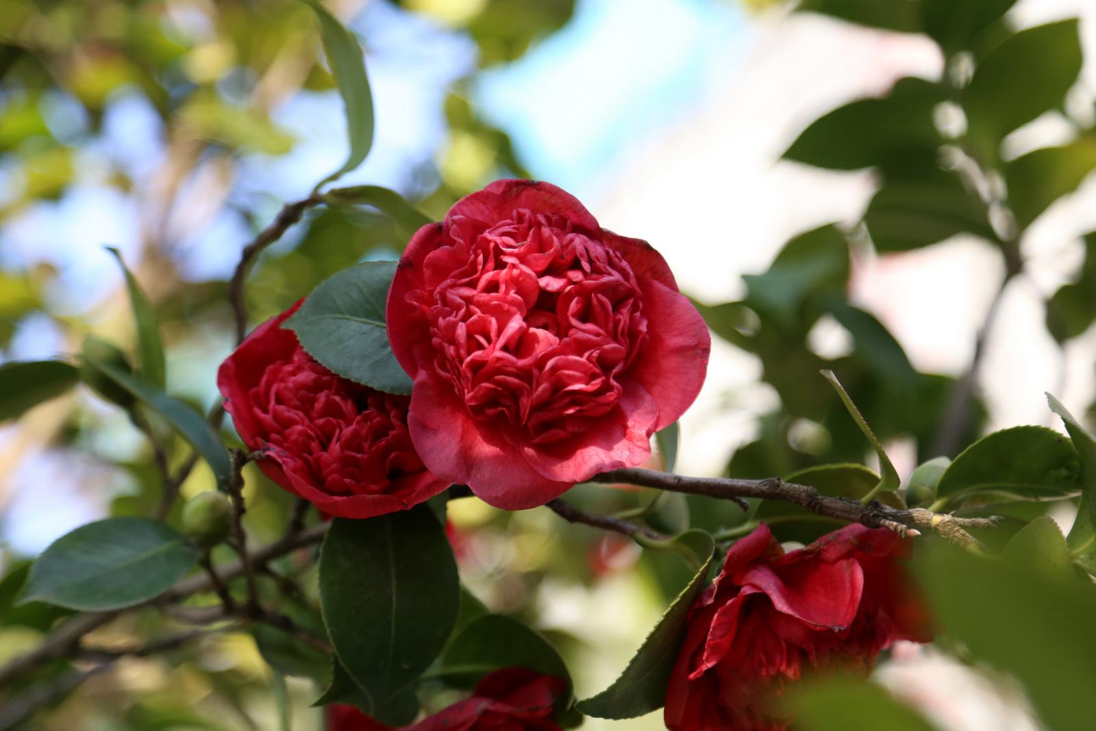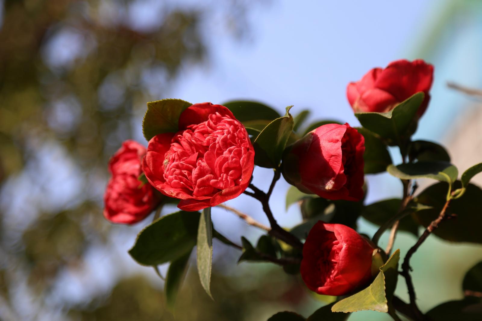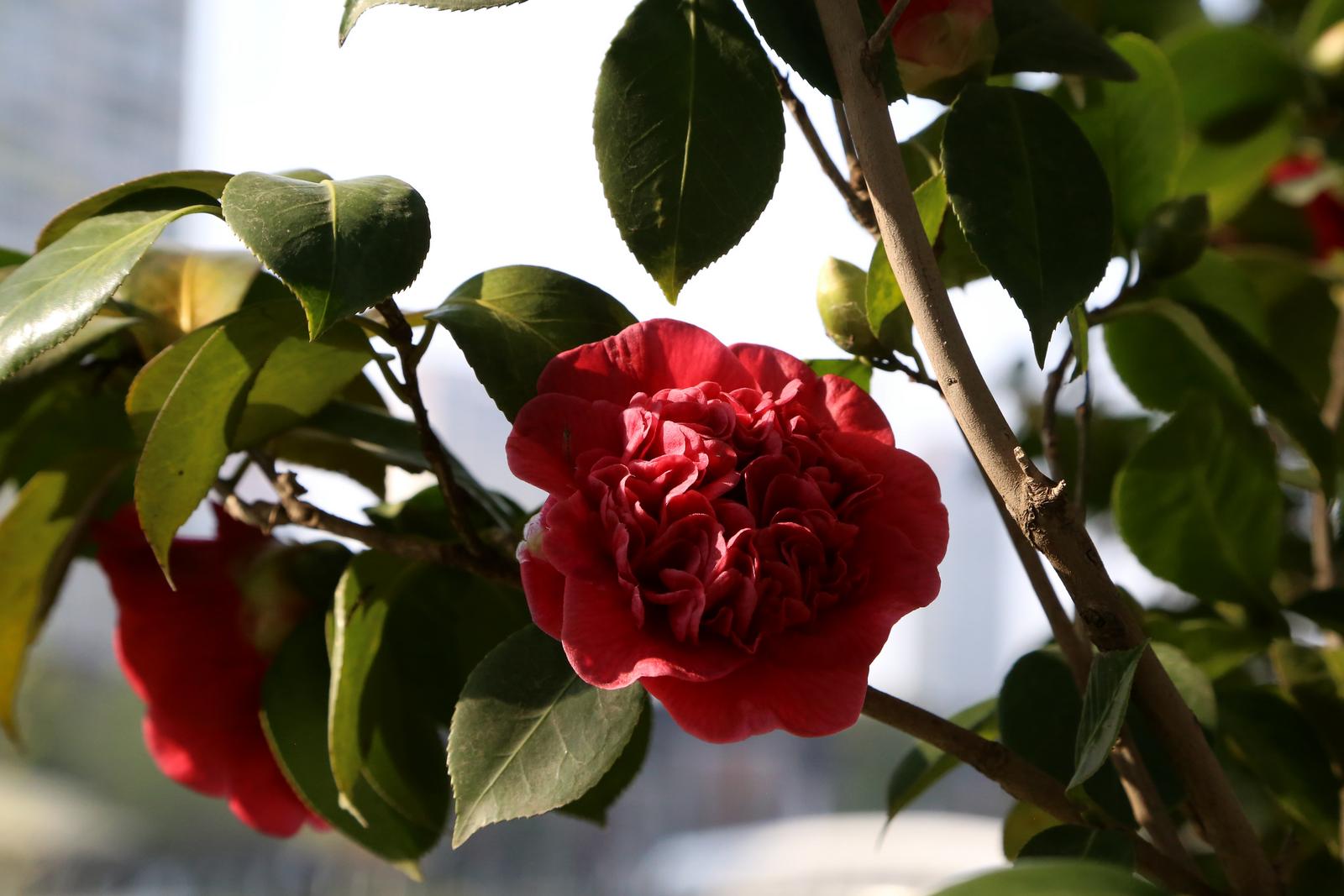 漫步在公园,微风拂过,山茶花随风摇曳,散发出阵阵清香,令人心旷神怡。盛开的花瓣层层叠叠,硕大的花朵缀满枝头,重重叠叠的花瓣如同红绸精心雕琢,细腻而富有质感。