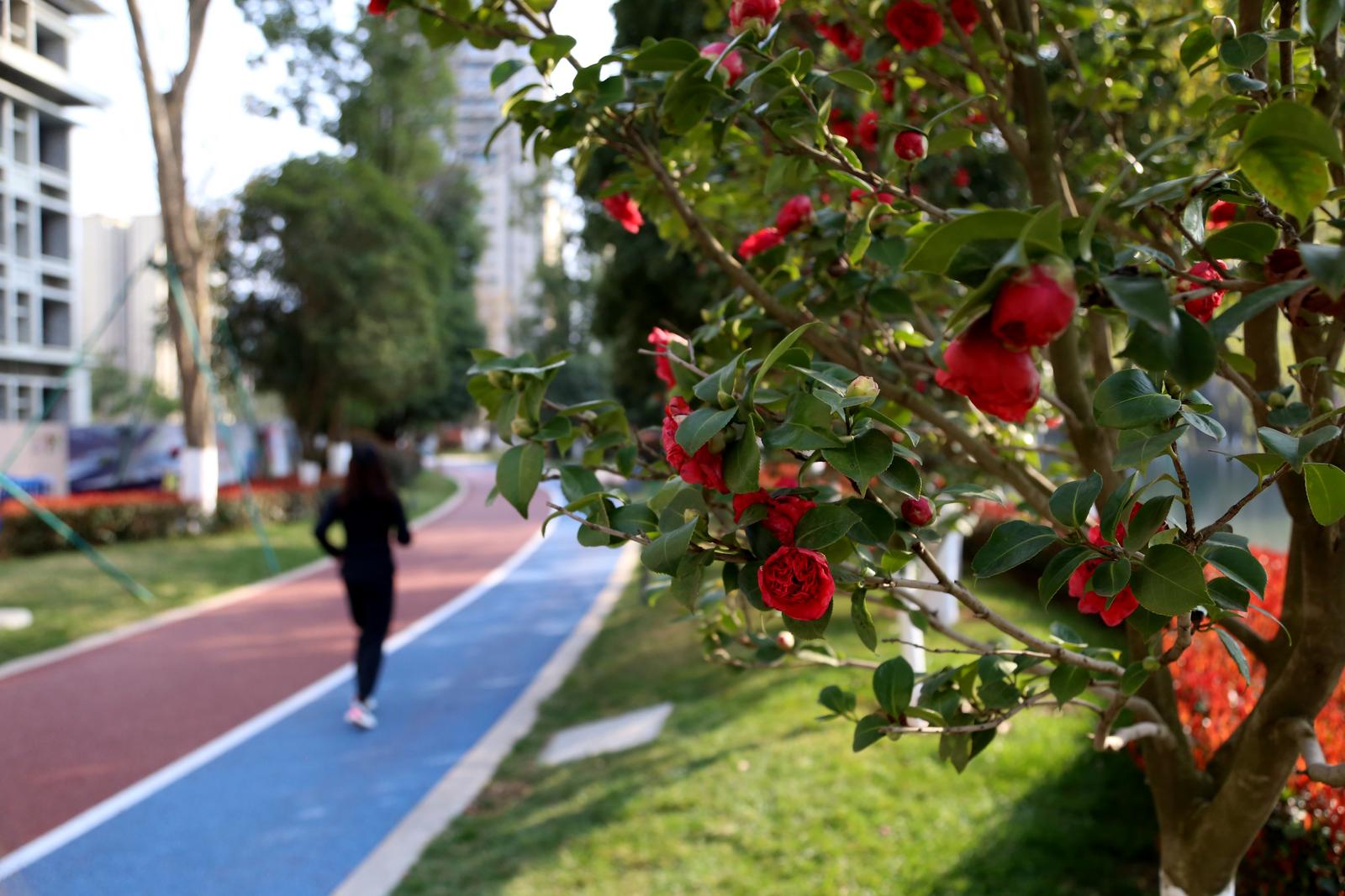 连日来,乌蒙水乡公园里的山茶花竞相绽放,这些山茶花分布在公园的各个角落,一簇簇、一朵朵,红得似火,娇艳欲滴,吸引了很多市民前来赏花拍照。