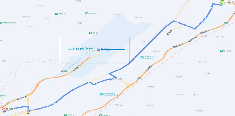K46路原起终站为“云桥村(始发站)——大板桥公交车场(终到站)”,为满足云桥村片区、滇中新区各产业园区及长水航程小区市民的出行需求,拟对K46路的线路走向和停靠站点进行局部优化调整,新增停靠“大板桥明应寺、电杆厂、阿依村”等公交站。
