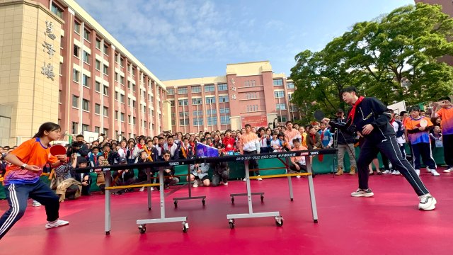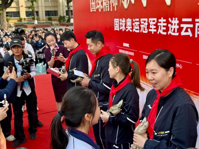 在云南师范大学实验中学,马龙、许昕、刘诗雯、李晓霞四位奥运冠军和学校乒乓球队的队员们开展了一场精彩的友谊赛。同学们手持球拍、全神贯注,与奥运冠军同场竞技、提升自我。